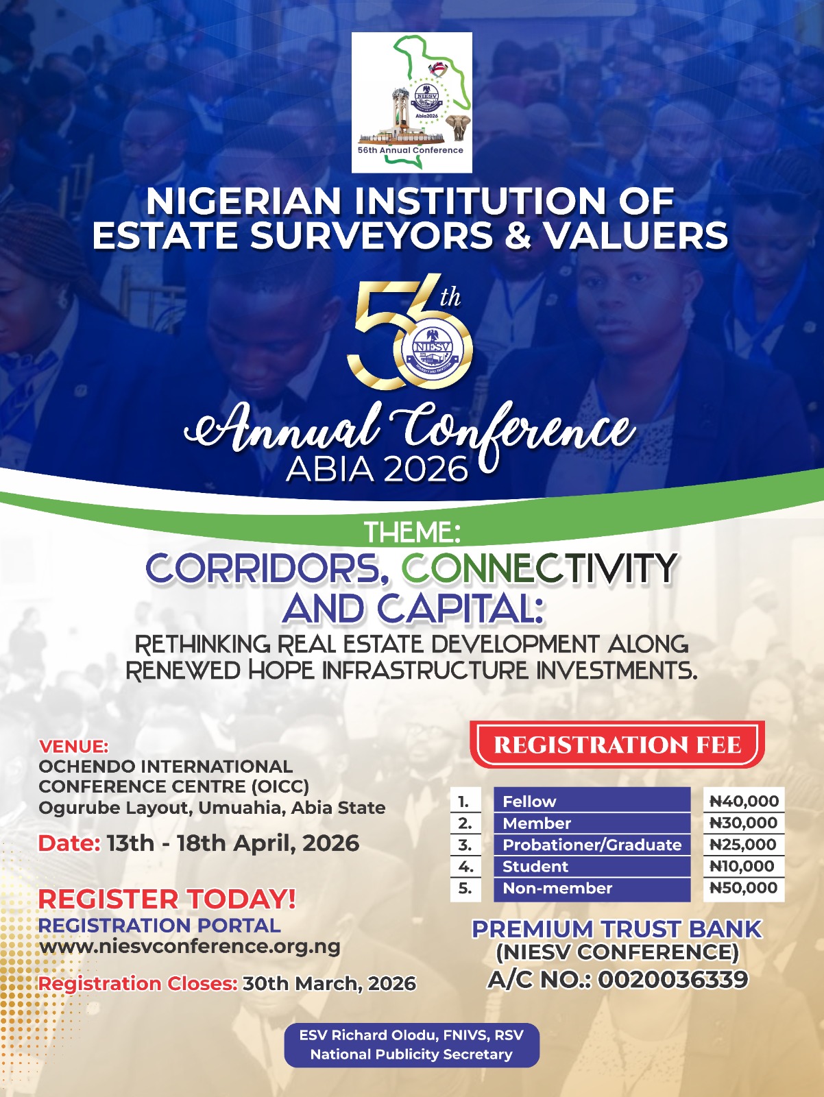 The Conference is organized by Nigerian Institution of Estate Surveyors and Valuers (NIESV). The event seeks to provide a robust platform for exchange of ideas among professionals, policymakers, investors, academics, and stakeholders within the built environment. It aims to deepen understanding of how renewed infrastructure investments - transport, energy, digital, and industrial corridors are reshaping real estate markets, land values, urban form, and capital flows across Nigeria and Africa.